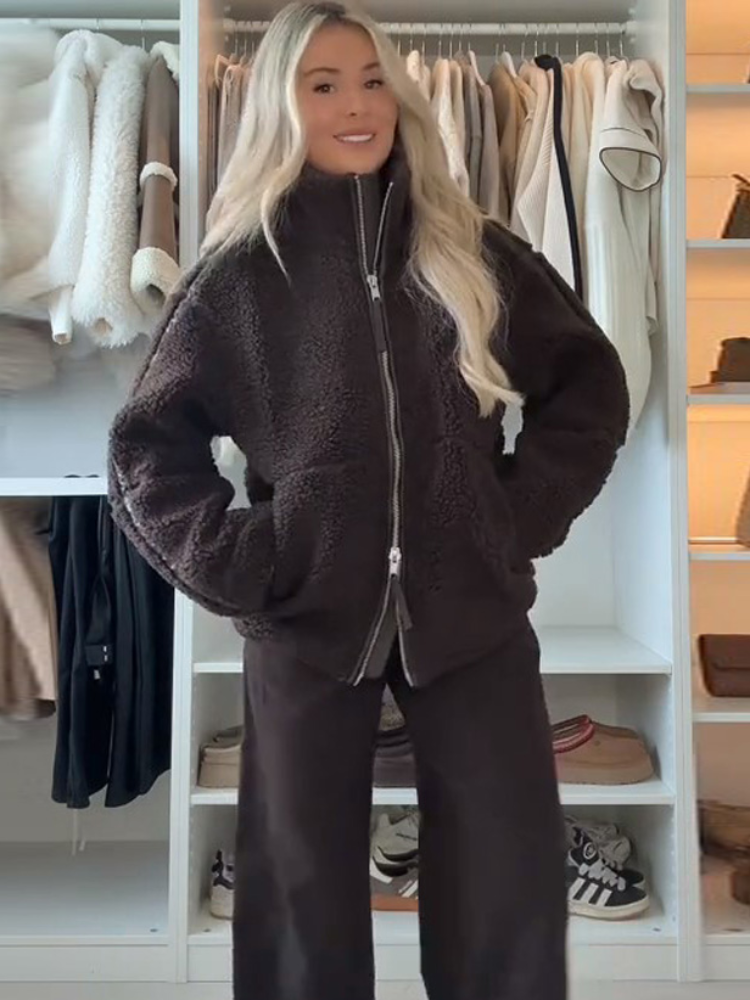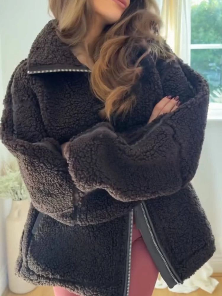 Avvolgente, morbida e irresistibilmente chic — questa giacca in peluche è la definizione perfetta di comfort moderno. Il suo design oversize, con zip frontale e texture soffice, regala un look rilassato ma curato. Un capo che combina calore e stile con la naturalezza tipica di chi non deve sforzarsi per distinguersi.